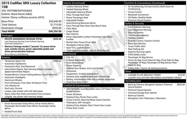 Recent Arrival!2015 CADILLAC SRX LUXURY*****Elevate your driving experience with this stunning 2015 Cadillac SRX Luxury. Meticulously maintained and brimming with premium features, this SUV is the perfect blend of style, comfort, and performance.- Navigation System- Driver Awareness Package- Tire, Compact Spare- License Plate Bracket, FrontSlip behind the wheel and be captivated by the SRX's refined interior, which boasts Choco Sapele Wood Trim, a Bose Centerpoint Surround Sound 10-Speaker System, and a power UltraView Double-Sized Sunroof. The adaptive remote start and memory seating ensure you'll always feel at home.Navigating city streets or winding country roads, the SRX's 3.6L V6 engine and 6-speed automatic transmission deliver a responsive, confident ride. With an EPA-estimated 24 MPG highway, this Cadillac balances power and efficiency to elevate your daily commute.Safety is a top priority, and the SRX delivers with features like Forward Collision Alert, Lane Departure Warning, and a Rear Vision Camera. The Side Blind Zone Alert and Rear Cross-Traffic Alert help you maneuver with confidence.Whether you're embarking on a road trip or tackling your daily routine, this 2015 Cadillac SRX Luxury is the perfect companion. Experience the exceptional craftsmanship, advanced technology, and refined driving dynamics that set this SUV apart.We invite you to visit our showroom and take this Cadillac for a test drive. Let us demonstrate how this exceptional vehicle can enhance your driving experience and exceed your expectations.All vehicles are one of each. All Pre-Owned or Certified vehicles are Used. The offering price of this vehicle is conditioned on a negotiated waiver of implied warranties if the Buyers Guide on the vehicle is AS IS-NO DEALER WARRANTY. If the Buyers Guide on the vehicle is IMPLIED WARRANTIES ONLY, the offering price includes implied warranties. A dealer documentary service fee of up to $200 may be added to the sale price or capitalized cost. All financing is subject to credit approval. Prices exclude tax, title, and license and are valid for Washington residents only. All transactions are negotiable including price, trade allowance, interest rate (of which the dealer may retain a portion), term, and documentary service fee. Any agreement is subject to execution of contract documents. Every reasonable effort is made to ensure the accuracy of this data. Please verify any information in question with a dealership sales representative.