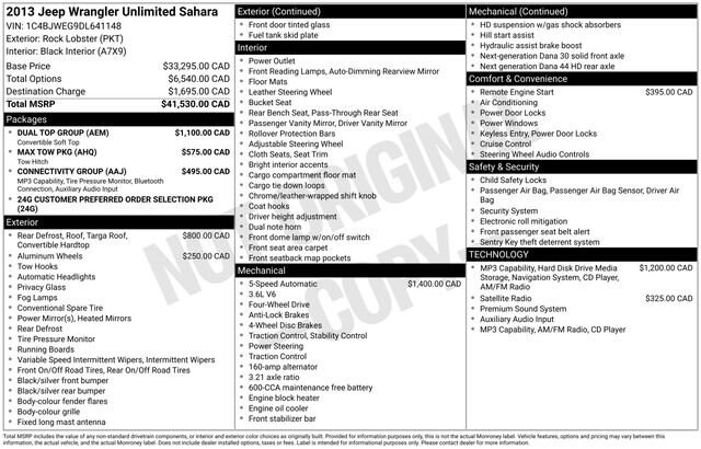 Clean CARFAX!Experience the Unmatched Capability and Versatility of the 2013 Jeep Wrangler Unlimited SaharaThis remarkable 2013 Jeep Wrangler Unlimited Sahara is the ultimate off-road companion, ready to take you on unforgettable adventures while delivering the comfort and convenience you demand. Boasting a powerful 3.6L V6 engine, four-wheel drive, and an impressive array of premium features, this Wrangler Unlimited is the perfect blend of rugged capability and modern refinement.- Connectivity Group- Dual Top Group- Max Tow Package- Quick Order Package 24G- Hill Descent Control- Sunrider Soft TopSlip behind the wheel and you'll be captivated by the Wrangler's exceptional handling and responsive performance, thanks to its heavy-duty suspension, traction control, and brake assist. The spacious interior offers ample room for passengers and cargo, with thoughtful touches like the 6.5 touch screen display, SiriusXM Travel Link, and remote USB port keeping you connected and entertained on the go.Designed to conquer the toughest terrain, this Wrangler Unlimited Sahara is equipped with a wealth of off-road-ready features, including 4-wheel disc brakes, a Class II receiver hitch, and 18-inch polished aluminum wheels. Whether you're tackling the trails or navigating the city streets, this Jeep's iconic styling and uncompromising capability will make every journey an unforgettable experience.Imagine the possibilities with this 2013 Jeep Wrangler Unlimited Sahara. With its exceptional versatility, premium amenities, and unparalleled off-road prowess, this Wrangler is the ultimate adventure-ready companion. Visit our showroom today and let us demonstrate how this remarkable Jeep can elevate your driving experience.All vehicles are one of each. All Pre-Owned or Certified vehicles are Used. The offering price of this vehicle is conditioned on a negotiated waiver of implied warranties if the Buyers Guide on the vehicle is AS IS-NO DEALER WARRANTY. If the Buyers Guide on the vehicle is IMPLIED WARRANTIES ONLY, the offering price includes implied warranties. A dealer documentary service fee of up to $200 may be added to the sale price or capitalized cost. All financing is subject to credit approval. Prices exclude tax, title, and license and are valid for Washington residents only. All transactions are negotiable including price, trade allowance, interest rate (of which the dealer may retain a portion), term, and documentary service fee. Any agreement is subject to execution of contract documents. Every reasonable effort is made to ensure the accuracy of this data. Please verify any information in question with a dealership sales representative.